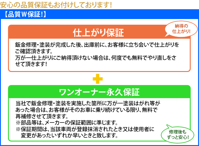 また、当社が整備させて頂いた部分は「修理永久保証書」に基づき、板金修理した箇所は、お客様がそのお車に乗り続けている限り品質を保証します。